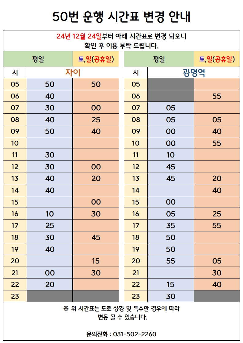 [경원여객] 50번 노선 시간표 공지 (24년 12월 24일 부터 ~ 변경시까지)